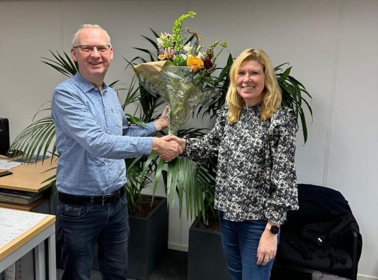 Dat lieten we natuurlijk niet ongemerkt voorbijgaan. Haar collega’s van de afdeling Calculatie verraste haar met een mooie bos bloemen en leuk cadeaupakket.
